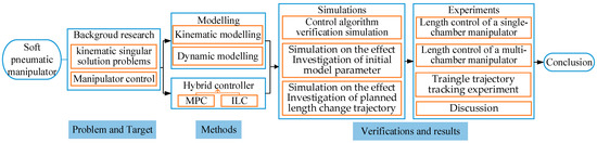 The scientific flowchart of this paper is shown in Figure 1. The rest of this paper is organized as follows. Section 2 describes the designing and manufacturing method of the multi-chamber continuous soft manipulator. Section 3 describes the kinematics and dynamic model. Section 4 describes the derivation process of the model-based parameter adaptive learning control algorithm. In Section 5, simulations based on different control algorithms are conducted and compared. In Section 6, experiments are carried out and the results are analyzed. Finally, conclusions are made in Section 7.