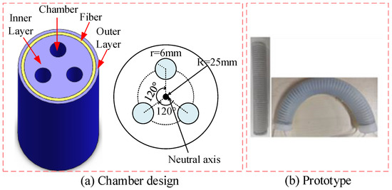 The prototype is shown in Figure 2a. It contains chambers, inner layer, fiber, and the outer layer. The three chambers are separated by 120° intervals and their radii is equal. This structure enables the soft pneumatic manipulator to extend and contract, as well as bend in the space. Inspired by the design in [34], each pneumatic chamber is reinforced with a thin nylon fiber, forming a tight spiral on the outside of the cavity in the form of a diagonal. The radial expansion of the soft manipulator is limited and axial stretching is allowed. The purpose of covering the fiber layer with a silica layer is to prevent the fiber from slipping, which will affect the bending angle of the manipulator.