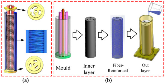 The manufacturing process of the multi-chamber soft pneumatic manipulator. (a) Design of the inner layer mold. It is composed of 3 chambers with a diameter of 6mm and an inner wall with a diameter of 25 mm. The inner wall is spirally convex, which is convenient for subsequent Fiber winding. The top fixing is used for sealing and positioning and the mold is made by 3D printing. (b) The manufacturing process of the soft manipulator, including the inner and outer mold design.