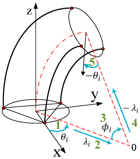 When establishing the dynamic model, the curved section is divided into countless small slices. The thickness of each slice is , where represents the arc length of the central axis. Note the modal rotation matrix as and the modal position vector as .