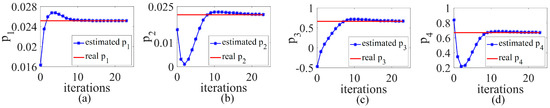 The changes of the dynamic model parameters alone with the iterative process of the control algorithm. ((a–d) represent the changes of P1, P2, P3, P4 along with iterations, respectively).