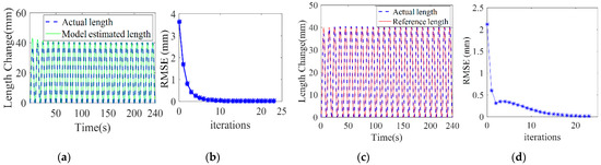 In addition, as the number of iterations increases, the input pressure is brought into the real model and the estimated model, respectively. It can be seen from Figure 7a that the chamber length of the estimated model gradually tends to the real chamber length after model parameter iterative learning. The root mean square error (RMSE) between the estimated chamber length and the real length is shown in Figure 7b. After 15 iterations, the RMSE approaches 0. This result indicates that the proposed control algorithm can effectively improve the accuracy of the model parameters. In Figure 7c we can see that the real chamber length gradually tends to the reference length. The RMSE between them is presented in Figure 7d which shows that, after 20 iterations, the RMSE is 0.57 mm. Compared to the 150 mm long manipulator, this RMSE value is very small. This result indicates the good convergence performance of the control algorithm in length control.