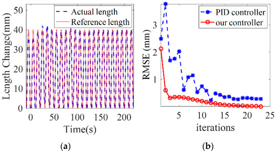 PID control simulation results. (a) shows the true chamber length, which can also tend to the reference length after more iterations. (b) the RMSE between the PID control algorithm and the proposed control algorithm.