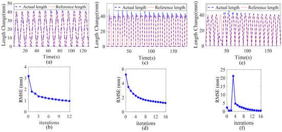 In the simulation results in Figure 11, a trajectory tracking effect under the step length change, the rectangular wave length change, and the sine wave length change are, respectively, shown. As shown in Figure 11b,d,f, the RMSE under the sine wave reference trajectory becomes almost 0 after 15 iterations, and the RMSE under the step signal reference trajectory also changes from 5.3 mm to 1 mm after 15 iterations. Even if the step chamber length change is used as the reference trajectory, the tracking error can still gradually converge towards the decreasing direction with iterations, and the error is reduced by 72%. It is further verified that the proposed control algorithm can maintain convergence under different reference trajectories.