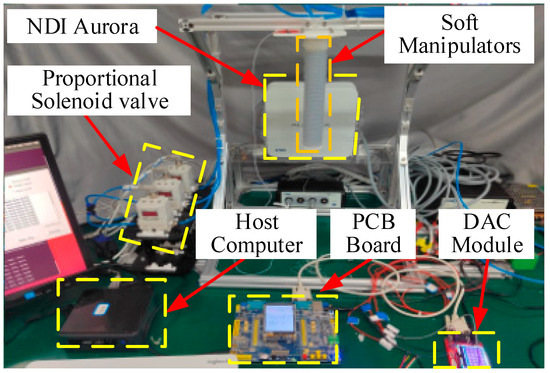 Experimental setup. The control algorithm is implemented on host computer (64-bit operating system, i5 CPU, and 16 GB RAM) based on ROS operating system. The pressure of the chamber is controlled by the SMC electric proportional valve (ITV1050). The NDI Aurora electromagnetic positioning system is used to capture the end pose of the actuator and communicate with the host through a serial port. The PCB broad is mainly used for hardware control drive.