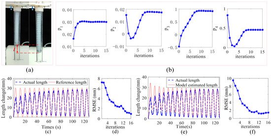 Experiment results are shown in Figure 13. As shown in Figure 13a, the manipulator begins to elongate after being pressurized. It can be seen from Figure 13c that in the first sampling period, the maximum chamber length change is 21.3 mm, which is 8.7 mm away from the expected length change peak 30 mm. The relative error is. As the number of iterations of the control algorithm increases, the real chamber length change keeps approaching the desired length change trajectory. After 10 iterations, the maximum length of the chamber change is 28.3 mm, which is 1.7 mm away from the expected peak trajectory, and the error is reduced to 5%. Figure 13d shows the RMSE of the real chamber length and the expected trajectory at each sampling time. It can be seen that RMSE has been decreasing from the initial 7.3 mm, and when the sampling ends after 16 iterations, it becomes 0.9 mm, which verifies the expected trajectory tracking performance of the proposed control algorithm. Similarly, Figure 13e,f show the performance of the control algorithm model parameter learning. The model estimated chamber length continues to tend to the actual chamber length, and the corresponding RMSE continues to decrease.
