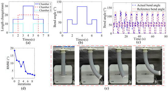 The experimental results are shown in Figure 14. It can be seen from Figure 14c that in the first iteration when the dynamic model is used as the initial value of the soft arm model, the peak bending angle is 102°. Compared with the expected trajectory peak bending angle of 126°, the error between the real bend angle and the desired bend angle (obtained through desired chamber lengths) is 20.1%. As shown in Figure 14d, the RMSE of the first iteration in the multi-chamber manipulator is 18.97°. With the iterative calculation of the control program, the error gradually decreases.