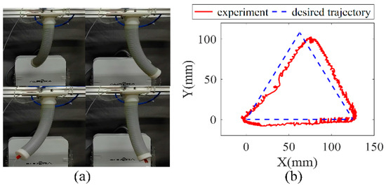 The experiment process is shown in Figure 15a. The end position is recorded by the NDI electromagnetic positioning system. It can be seen in Figure 15b that the experimental trajectory of the three-chamber continuous soft manipulators basically matches the desired equilateral triangle trajectory, the maximum absolute error is within 15 mm, and the average error is 4.7 mm, compared to the 150-mm-long manipulator. This result indicates that the proposed control method has good control accuracy of the soft pneumatic manipulator.