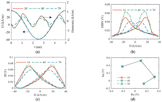 In each test, magnetic signals in five magnetization cycles of the low-frequency magnetic field were acquired and averaged. Figure 2 shows the patterns of the multifunctional magnetic signals obtained from the specimens of different surface hardness. The features of the magnetic patterns regularly varied with the surface hardness of specimens, indicating the feasibility of surface hardness characterization with magnetic features.