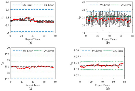 Multiple magnetic features were simultaneously measured with the instrument and thus the repeatability of the instrument should be discussed for individual magnetic features. Figure 3 demonstrates the measured data (770 data points sorted by the repeating times) of typical magnetic features. The error bars were plotted to demonstrate the extent of variation in the data under static conditions. The fluctuation in the mean value (red dot) as the repetitions indicated the repeatability of the instrument under dynamic conditions. The error bars were too short to recognize in Figure 3c,d, indicating the excellent repeatability of the instrument in measuring the magnetic features of x20 and x36 under static conditions.