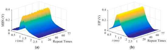 As shown in Figure 3b, the measured data of magnetic features of x15 (extracted from the MBN signal) showed severe fluctuations during every test. Through recalling the measured patterns of MBN, the MBN envelope of a half magnetization cycle is demonstrated as the 3D image in Figure 4a. Compared with the smooth image of EIP in Figure 4b, both the peak and its position of MBN envelop vary in a certain range to cause a noised ridge along the axis of date. The distortion in the MBN envelop observed under dynamic conditions was mainly ascribed to the randomness of the Barkhausen events, which had been proven as a stochastic process during the material magnetization [18]. Therefore, the repeatability of the instrument in measuring magnetic features extracted from MBN signals was expected to be worse than that of the magnetic features of EIP.