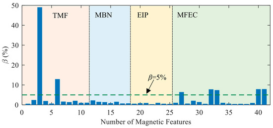 The repeatability of the instrument under dynamic conditions was estimated with the variations of the mean values of magnetic features measured under dynamic conditions. The coefficient of variation estimated from the data of the mean value of the magnetic feature, which can be observed from the data points marked as red dots in Figure 3a–d, is shown as the histogram in Figure 6. As expected, the magnetic features with a large value of β under static conditions also demonstrated significant fluctuations under dynamic conditions. However, under dynamic conditions, the values of β corresponding to the magnetic features of MBN and EIP are very close, which differs from the conclusions observed under static conditions.