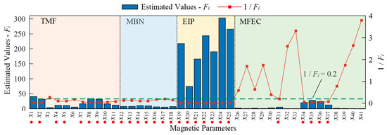 where N represents the quantity of specimens. To estimate the performance of magnetic features in surface hardness evaluation, an indicator similar to the signal-to-noise ratio is proposed as . The estimated values of Fi are plotted as bars in Figure 7. When , the corresponding magnetic feature of xi is considered to be not enough for surface hardness characterization.