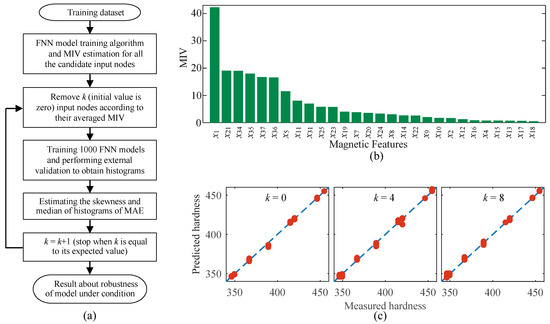 A total of one hundred FNN models were trained before evaluating the MIV of magnetic features (or candidate input nodes). During the training process of FNN models, the data obtained from the 4# specimen were excluded and the magnetic features measured from the other seven specimens in the first-stage experiment were used as the input dataset. Through estimating the MIV of individual magnetic features with the one hundred trained FNN models, all the investigated magnetic features could be sorted in descending order of their averaged MIV. The sorting results of candidate input nodes according to their estimated values of MIV are shown in Figure 9b.