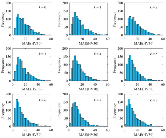 According to the procedure sketched in Figure 9a, the FNN models with k-filtered magnetic features were generated. The prediction accuracy of the established models with different values of k could be evaluated with the histograms (Figure 10). For the reference model (k = 0), its corresponding median and sknewness were estimated as 15.3 HV and 1.04, respectively. When the value of k increased from 0 to 8, the median showed an overall descending trend, whereas the sknewness demonstrated an upward trend (Figure 11a). For instance, the median reached its minimum value of 11.0 HV among the investigated cases when k was 6. The value of sknewness obtained in the case of k = 6 was around 30% larger than that of the reference model, indicating an improvement in model robustness.