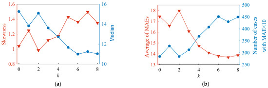 (a) Curves of estimated skewness and median; (b) Average MAE and the number of cases with MAE less than 10.