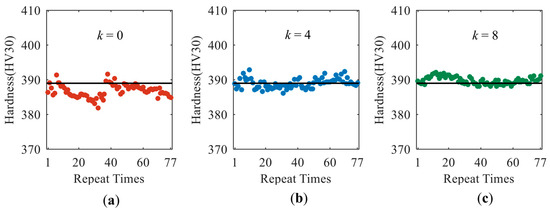 (a–c) show the quantitative prediction results of surface hardness with the models of k = 0, k = 4 and k = 8, respectively.