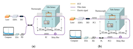The schematic diagram for investigating the temperature response of the polarized and depolarized GAWBS spectrum is illustrated in Figure 1. For both configurations, output light from a narrow linewidth semiconductor laser (NLLD-0175-3-34-2, center wavelength: 1550.12 nm, linewidth: 15 kHz) is amplified to 19 dBm by an erbium-doped fiber amplifier (EDFA) as the pump light. An isolator (ISO) is placed after the EDFA to block reflected light for protection. As shown in Figure 1a, when pump light enters the Sagnac loop consisting of a 50:50 fiber coupler, this interferometer structure converts the acoustic wave-induced phase modulation to intensity modulation. In the above setup, radial and torsional-radial acoustic waves can both be excited [23], so it is necessary to adjust the polarization controller (PC) in the loop to suppress the torsional-radial acoustic modes as much as possible, and retain only the polarized GAWBS spectrum induced by radial acoustic modes. Then, the beat signal of the pump light and the scattered light by polarized GAWBS is detected by a fast photodetector (PD, bandwidth: 350 MHz). Finally, the polarized GAWBS spectrum is observed by an electrical spectrum analyzer (ESA, bandwidth: 6.2 GHz) with a frequency resolution of 1 kHz after being averaged by 1000 times. Unlike the setup shown in Figure 1a, the setup in Figure 1b is used to excite and demodulate depolarized GAWBS process in FUTs two PCs, and a polarizer (PL) are used to convert the TR2,m modes induced polarization modulation to amplitude modulation. Similar to Figure 1a, the beat signal of the pump light and the scattered light by depolarized GAWBS is detected by a PD, the spectrum of which is analyzed by the ESA.