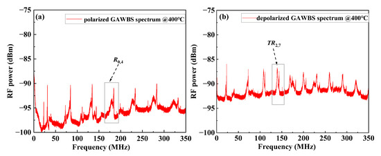 Figure 2a,b show the measured polarized and depolarized GAWBS spectra at 400 °C by using the above configurations, respectively. A series of resonance peaks corresponding to the first 7 orders of R0,m modes (m = 1,2,…,7) can be observed in Figure 2a, in which the spectrum is also mixed with low-frequency noise caused by the external environmental disturbances and incompletely suppressed resonance peaks induced by low-order TR2,m modes (m = 1,3,4,7). Although the TR2,m modes induced depolarized GAWBS resonance peaks can be suppressed by adjusting the PC in the experimental configuration at low temperatures, these resonance peaks reemerge with the increasing temperatures as both polarized and depolarized GAWBS would be enhanced with temperature increase (detailed analysis later). Resonance peaks in Figure 2b correspond to the first 16 orders of TR2,m modes (m = 1,2,…,16), which have higher radio frequency (RF) powers without the use of a 50:50 fiber coupler in the setup shown in Figure 1b. Considering that the resonance peaks corresponding to the R0,4 mode (near 178 MHz in Figure 2a) and TR2,7 mode (near 140 MHz in Figure 2b) have a relatively large SNR, their temperature dependence are investigated [21]. The acoustic mode order of the resonance peaks in the GAWBS spectra obtained from the experiments for both polarized and depolarized GAWBS can be identified according to the calculated values of the corresponding resonance frequencies using Equations (1)–(3). The numerically calculated results of the resonance frequencies for both polarized and depolarized GAWBS in silica SMF, and the corresponding measured results are listed in Table 1.