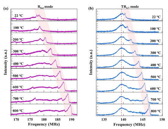 To investigate the temperature dependence of the GAWBS spectra, the temperature of the furnace tube is changed from 22 °C to 800 °C with a step of 100 °C. Figure 3 shows the test results of the R0,4 mode and TR2,7 mode induced spectra at different temperatures. It is clearly seen that the center frequency of the resonance peak increases with increasing temperature. Besides the center frequency, it can be found that the SNR of the GAWBS resonance peak of the FUT also increases with the temperature (detailed analysis later), while the linewidth of the peak narrows down with the temperature. Since the two modes have similar thermal response to temperature, and the TR2,7 mode induced GAWBS spectra have higher RF power, narrower linewidth, and less noise interference from the intrinsic noise of the instruments, TR2,7 mode is selected as an example for detailed analysis.
