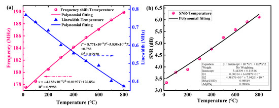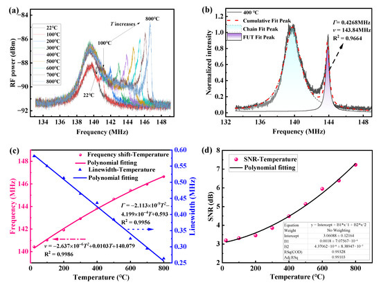 The measured results of the TR2,7 mode induced GAWBS spectra at different temperatures, normalized and Lorentz fitting spectrum at 400 °C, the temperature-dependent resonance frequency shift and linewidth variation of the resonance spectra, and the temperature-dependent SNR of the resonance spectra are shown in Figure 4. In Figure 4a, it is seen that each spectrum measured at each temperature consists of two peaks, one with an almost fixed lower frequency corresponding to the depolarized GAWBS occurring along the fiber chain including delayed fiber and fiber patch cords, and the other one with higher increasing frequencies when temperature increases corresponding to the depolarized GAWBS occurring along the FUT. The center frequency of the first resonance peak contributed by the fiber chain can be used as a reference at room temperature for the absolute temperature measurement when monitoring the center frequency of the second resonance peak in Figure 4a. Note that as the length of the FUT is smaller than that of the fiber chain, the strength of depolarized GAWBS in the FUT is normally smaller than that in the fiber chain at relatively low temperatures, resulting in a higher SNR value of the first resonance peak than that of the second peak in Figure 4a, as observed for temperatures below 600 °C.