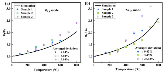 When the temperature changes, Ωa and Γm perform very important roles in the spectral shape and the value of gT (T denotes temperature), neff and ρ0 also have a weak impact on gT. The rates of change of the parameters for silica fibers at high temperatures are given by [37]: (Δneff/neff) = 7.6 × 10−6/°C, (Δρ0/ρ0) = −1.83 × 10−6/°C. As the linewidth Γm has the largest rate of change with negative values when temperature increases, the gain coefficient gT will increase with temperature according to Equation (8). The rate of change obtained in Figure 4c and Figure 5a can be taken into Equation (8) to derive the relationship between the gain coefficient gT and the temperature. In studying the effect of temperature on the gain coefficient of GAWBS, we selected samples of different lengths for multiple tests to investigate whether the sensing fiber length would affect the high temperature sensing performance. In most of the previously published works on the sensing characteristics of GAWBS in SMF, the FUT lengths chosen by researchers are between 10–15 m [29,30,43], which ensures a relatively highly efficient GAWBS process with high-SNR resonances and at the same time a minimized fiber probe for point sensing. For the above reasons, two groups of FUTs, each consists of three different fiber segments (Sample 1, Sample 2, and Sample 3) with lengths of 10 m, 12 m, and 15 m, respectively, are tested to obtain the gain coefficients gT at different temperatures in the polarized and depolarized GAWBS experiments. Figure 6 shows the measured and calculated gT/g0 of R0,4 mode and TR2,7 mode, where g0 is the gain coefficient at 22 °C. It can be found in Figure 6 that the test results for Sample 1 and Sample 2 for both the R0,4 and TR2,7 modes are almost consistent with the simulation results, with the averaged deviation of the experimental test results from the simulated values less than 10%. These deviations mainly come from different tensile strain, bending stress, and torsional deformation distributed along the FUTs when they are manually looped into ring structures and different heat distributions when placed into the furnace tube with narrow space. It is also seen that the test results for Sample 3 for TR2,7 mode have larger deviations from the simulation results than those for R0,4 mode, which is mainly due to the fact that the depolarized GAWBS process is more sensitive to the stress/strain-induced birefringence changes along the sensing fiber than the polarized GAWBS as Sample 3 is the longest sample which suffers the most nonuniform stress/strain distributions when looped into the ring structure. Additionally, different tensile strain, bending stress, and torsional deformation, and nonuniform heat distribution introduced to the samples for both mode measurements during the processes of manual looping and insertion into the heat tube in each time would also contribute to the deviation differences. It is believed that the inconsistencies in the current results would be alleviated if the test samples are looped to rings with the same size and placed within high-temperature furnace with enough large space.