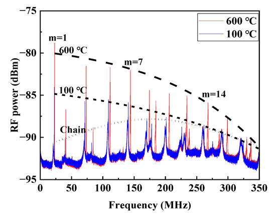 To illustrate the variation of SNR with temperature for all the measured modes of 16 orders, the test results of the 12 m FUT are shown in Figure 7. The peaks of these modes at 100 °C and 600 °C are extracted, and envelope curves covering resonance peaks for all the modes are plotted, respectively. It can be found that the SNR increases with temperature for all the first 15 orders of TR2,m modes (m = 1,2,…, 15), and it almost does not change with temperature for TR2,m modes of orders m > 15. This is because the linewidth Γm of the resonance spectrum induced by the depolarized GAWBS in the uncoated fiber increases linearly with m, as shown in Equation (7), and the corresponding linewidth changes δΓm (100 °C to 600 °C) are different for different acoustic modes when the temperature changes. Moreover, the relationship between Γm and gT is nonlinear, resulting in inconsistent SNR variations.