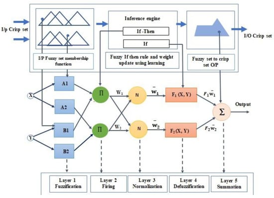 The ANFIS design architecture comprises two inputs (x, y), two rules (R1, R2), and five layered feed-forward networks, as shown in Figure 3. The design also indicates adaptive (square) and non-adaptive (circle) nodes with one output. The learning algorithm is used to update the adaptive node parameters by minimizing tracking errors between target data and ANFIS output. The two fuzzy if-then rules are determined as function of the inputs (x, y) [40]. A1, B1, A2, and B2 are the fuzzy sets and F is the number of membership functions. A typical ANFIS structure includes five layers. Layer 1 is the fuzzification layer, and every node I is an adaptive node in this layer. This layer’s outputs are the inputs’ fuzzy membership grades. Layer 2 is called the rule layer (the firing). It is a fixed node layer, labelled ∏. To obtain the output of layer 2, which is the product of all the incoming signals, the firing strength is computed. Layer 3 is the normalization layer. It has a fixed node, labeled N. Normalized firing strengths are the outputs of this layer. It determines the ratio of the ith rule’s firing strength to the total firing strength. Layer 4 is the defuzzification layer; it is a part that takes the fuzzy set inputs generated by the inference engine and transfers the fuzzy values into crisp values. Layer 5 is a summation neuron, a stationary node that adds all input signals together to compute the final output.