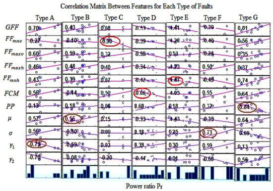 In the present article, the correlation between the Pr and the mathematical and statistical features is obtained for each type of fault. The features with high correlation with the power ratio are determined. Then, regression analysis is used to obtain the correlation equation between the high correlation features and the operating power ratio using Minitab 19 software. Figure 5 shows the correlation matrix between features with the Pr for each type of fault. The high correlation values are marked with red circles. For each type of fault, there is a feature that gives a high correlation with the Pr. Since the maintenance action of faulty modules with fault type H is to remove the module, this type of fault was not considered in the correlation with the Pr. It can be observed that the features that have a high correlation with the Pr include skewness (), FDM, ω, and PP.