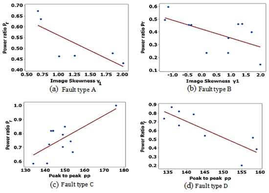 The results of regression analysis using Minitab software are shown in Figure 6. The regression model equation and the values of the R-squared and p-value for each fault type are shown in Table 5. The value of R-squared (0–100%) represents the scatter around the regression line. A p-value between 0 and 1 is commonly used to represent the level of statistical significance. The lower the p-value, the more evidence there is for rejecting the null hypothesis. A statistically significant p-value is usually less than 0.05. the combination of low p-value and high R-squared indicates that changes in the predictors are related to changes in the response variable and that the regression model explains a lot of the response variability. The combination of low p-value and low R-squared indicates that the regression model has significant variables but explains little of the variability. The results in Table 5 reveal that features with faults of type A, C, D, F, and G have high R-squared values. Type B and F faults, on the other hand, have low R-squared values. All types of faults have a low p-value, indicating strong evidence against the null hypothesis. The current study advises that more research should be carried out on the analysis of the operational power ratio for type B and F faults. Figure 6 shows that the values of Pr decrease with the increase in for A and B type faults. The variation of Pr with PP is dependent upon the fault type. The value of Pr decreases with the increase in PP for fault type D and decreases with the decrease in PP for fault type C.