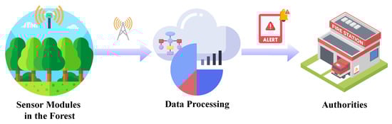 The possibilities and challenges in developing a robust surveillance system are many. In this sense, the new features inserted in Forest can digitize regions to help combat teams in decision-making. The Forest Alert Monitoring System (SAFe) project aims to build a Wireless Sensor Network (WSN) in the Serra da Nogueira forest, located in the northeast of Portugal [12]. The system proposed is divided into three main stages, as illustrated in Figure 1: 1—data acquisition in the forest, 2—data processing on the cloud, and 3—alert generation for the authorities. First, the sensor modules are strategically allocated in the forest for data acquisition (demonstrated in [13]) and pre-processed by the algorithms presented in this work.