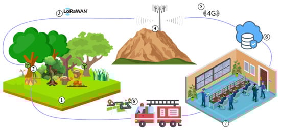 - The Control Center (➆) receives all information, computes the data, and sends alerts about hazardous situations or forest fire ignitions, to the surveillance agent in the region. Therefore, this control center has an associated server (➅) that stores all collected data over the years and performs artificial intelligence procedures which will generate forest ignition alerts, warning rescue and combat teams;