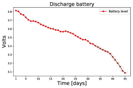 In previous work [14] the full data package is described (battery level, flames sensors, temperature, and humidity) and, it is demonstrated that the data package with all sensor values of each module can be sent using more than 60-second time intervals (in this case, the minimal time interval is 60 s). Using this configuration, each module can send data for almost 45 days, the Figure 3 shows the discharge battery from the high level to the low level in laboratory tests.