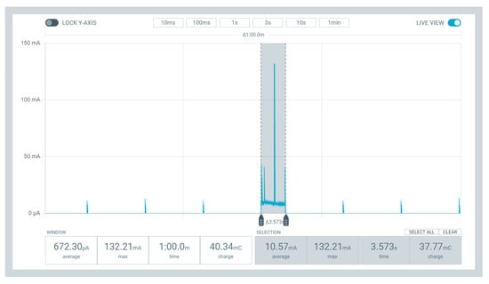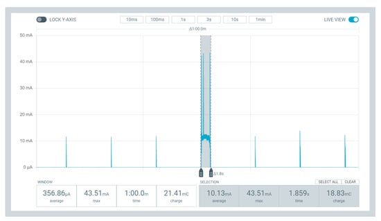 It is possible to define the PCB consumption used in SAFe’s WSN nodes with the nRF-PPK2 as the power supply, which means that the battery will be removed in a swap for VOUT and GND pins of the nRF-PPK2. Then, the power profiler application is set up to supply a voltage of V (the same as the model 18,650 battery [15]), 60 s to perform the measurement (the interval between each data transmission), and a data sampling of per second. Note that the LoRaWAN used in each module is based on Classe A, which has the lowest energy consumption among other class types. Moreover, despite the chance each module can receive control signals, the measurement presented here will not consider consumption while receiving messages.