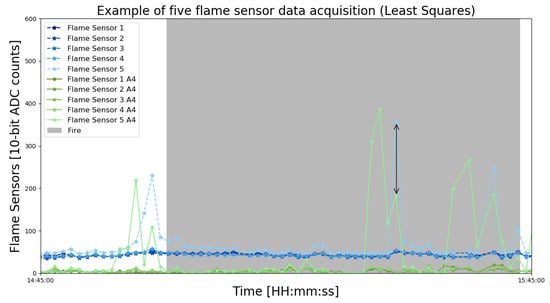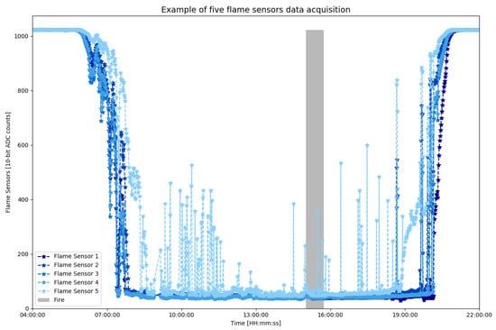 This ’s equation can return outputs in several time intervals; that is, it is possible to specify the window function in the time series data set to remove peaks in its values. These peaks are exhibited in Figure 5, where there is a graph with the values stored from the five flame sensors of a module in the interval from am to pm on a day with a fire test.