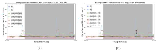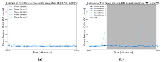 Zoomed view of the raw flame sensor data to compare the noises after the data acquisition of a fire test. (a) Noise in flame sensors without fire. (b) Noise in flame sensors with fire.