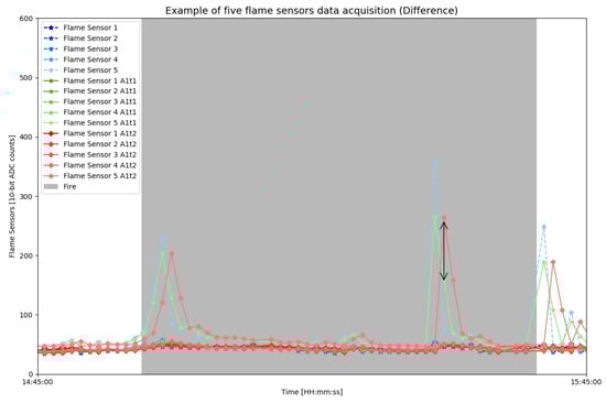 Over the indicated period, it can be observed that there are several peaks during the data reading. Nonetheless, there are different behaviors of these peaks. For example, in the samples from pm to pm without fire (shown by Figure 6a), the values float differently from the values (indicated by Figure 6b) in the period between pm and pm with fire.