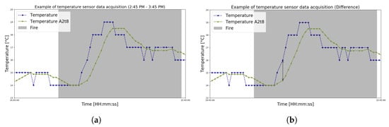 Zoomed plotting of the sensor module’s temperature data that exemplifies the difference proposed by approach through . (a) The raw and smoothed temperature sensor during a fire test. (b) Black arrow with unknown D size marking the difference between raw and smoothed data.
