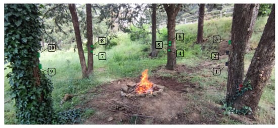 After all the security measures were checked, and with the approval of the firefighter, ten sensor modules were fixed around the bonfire in the prepared area. The prepared area has four trees arranged in a circle, ideal for keeping all modules at a relative distance. The scenario created for WSE can be seen in Figure 11.