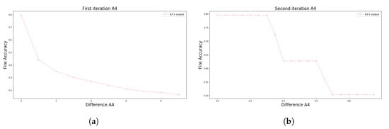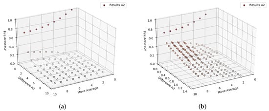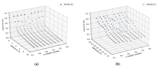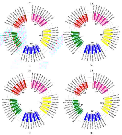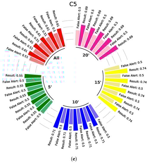 A possible tiebreaker between and could be performed by analyzing the false alerts of each one. However, comparing the false alerts between them would be unfair since they have different accuracy values. Thus, it is possible to score from (or vice versa), individually taking the ranges between the maximum and minimum values of its false alerts. However, both have equal extreme values of false alerts, for and for .