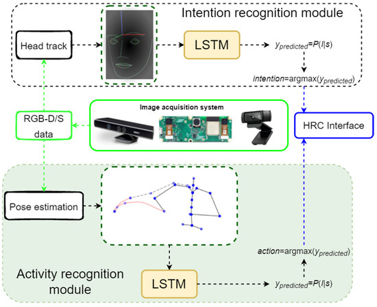 In recent years, researchers have begun to collect data that could be used to build DL models with action recognition HRC applications. These data are often difficult to analyze and annotate [20,21,22]. For example, in [23], the authors distilled spatial and temporal data representing human actions using convolutional neural networks (CNN) and long short-term memory (LSTM). In [24], an approach based on transfer learning is proposed, thus avoiding the need for a large amount of annotated data, whose collection is often a tedious job to perform. In [25], activity recognition based on built-in sensors in smart and wearable devices and custom-made HHAR-net is investigated.