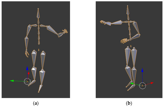 For the skeleton modality, a Combination Perception Neuron 32 Edition v2 motion sensor was used to capture MOCAP data at a frequency of 120 Hz [21]. The skeleton data comprises the 3D locations (Tx, Ty and Tz) of 17 major body joints, together with their rotations (Rx, Ry, and Rz). The data are saved in standard BVH file format and can be examined using various software packages, e.g., the Blender software, as shown in Figure 2.