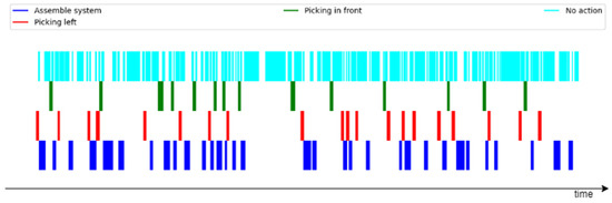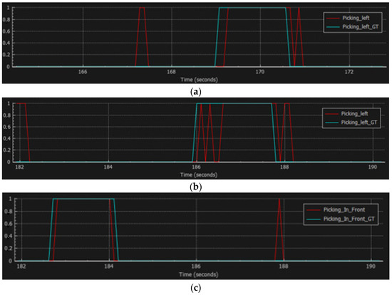 In Figure 12a–c, the classes of Picking Left and Picking In Front are evaluated. A visual inspection shows that the classifier performs well while working online (the entire sequence is processed) regardless of the lower accuracy. In this example, the ground truth interval starts at the ~169th second and ends at the ~170.7th second, while the predictions are shifted by ~0.2 s. In this example, some false positives can be observed, but they are short-lasting and can be mitigated by further processing. A similar performance is observed for the action of Picking in Front. As the acceptance criterion is set to 60% of the ground truth coverage for each detection interval, the reason for the lower performance, compared to that of the confusion matrix in Figure 11 becomes clear.