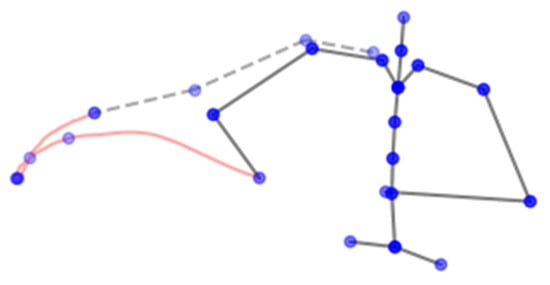 Upon the dataset’s analysis, it was determined that not all of the feature points of the skeleton hierarchy are necessary, and some can be excluded from the training of the model. The new skeleton hierarchy comprises points that are visible above the assembly surface, since the features are not visible to the camera in that area and deemed unnecessary for the purpose of activity recognition. Figure 4 represents a new hierarchy and an example of a relevant extremity trajectory.