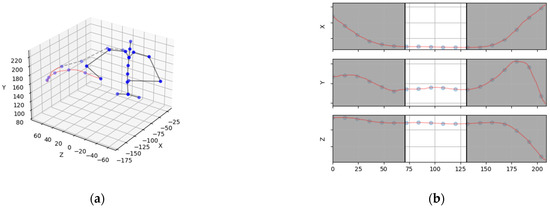 Image representing the skeleton data used for training the NN model and the sliding window approach: (a) view of the skeleton data with the points and motion data for one point (a hand motion is presented in this example); (b) hand motion presented as timeseries.