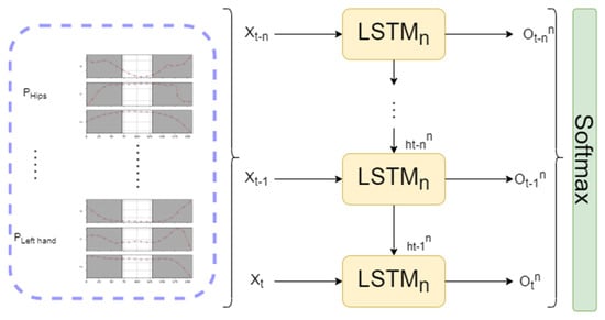 The selected model implements DNN with hidden LSTM layers (Figure 7). We used the rectified linear activation function (ReLu), since it overcomes the vanishing gradient problems present in RNNs [46,47]. It also allows models to learn faster and perform better. The Softmax function is used as an output layer from NN, since the desired output is a vector of probabilities. The probabilities of each value are proportional to the relative scale of each value in the vector and are interpreted as probabilities of the membership of each class.
