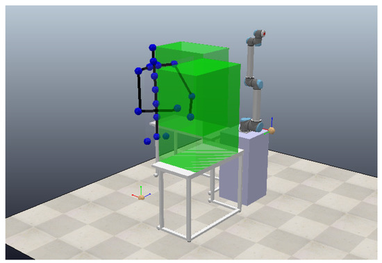 In this study, the HRC environment was modeled and implemented using the CoppeliaSimEdu software package [49]. CoppeliaSim is a robotic environment simulator with an integrated development environment. It is based on distributed control architecture, meaning that each object can be individually controlled via an embedded script, a plugin, ROS node, remote API client, or a custom solution. In this work, the HRC environment was modeled as a workspace shared by human and robot partners forming a manufacturing team. The workspace consists of two tables representing work surfaces with a robot on a mount and a space for the human worker, as presented in Figure 8. The human worker is represented as a set of joints acquired from the InHARD dataset. Green boxes are placed on top of the work surfaces to represent the event-trigger-activated safety zones.