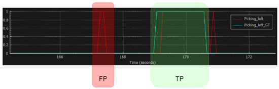 The example presented in Figure 9 demonstrates the distinction between the True Positive and False Positive detections (marked as TP and FP in the image). Here, we used the graph for the visual inspection and the arbitrary analysis of the proposed model’s performance. We found this method useful, since the detections are based on a temporal component, and the TP detection can be described as a set of predictions generated by the model that sufficiently overlaps with the ground truth (annotations) on a temporal axis of the graph. The FP detection can be described in the same manner as a model-generated prediction without sufficient overlap with the ground truth on a temporal axis. For the purpose of this work, sufficient overlap was determined to be arbitrary.