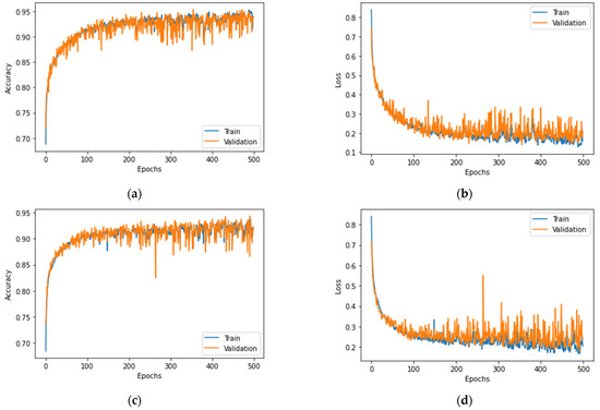 Accuracy and loss plots for training and validation: (a) accuracy plot for the network with 51 input features; (b) training and validation loss for the network with 51 input features; (c) accuracy plot for the network with 27 input features; (d) training and validation loss for the network with 27 input features.
