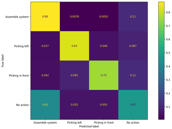 The results of the confusion matrix can be compared to the results of similar work described in [43]. The authors presented their results using four confusion matrices for each model, based on the motion completion percentage (25, 50, 75, and 100% completion). We compared the results regarding the 25% and 50% completed motions. Since the output classes of the network are different, we selected the Picking In Front and Picking Left classes as references, as these are most similar to the motions discussed in [43]. The authors of [43] were faced with similar issues when evaluating their similar classes for 25% motion completion. We encountered such issues in the case of the No Action and Assemble System classes, where 42% of the No Action class is recognized as the Assemble System.